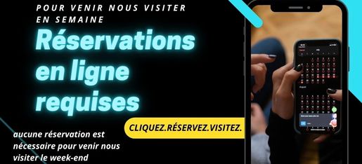 Les réservations sont requises pour venir nous visiter en semaine ( et non le week-end). Nous sommes fermés au public lorsque nous recevons des groupes. Il est donc important de réserver AVANT des vous déplacer en semaine. Merci pour votre collaboration.